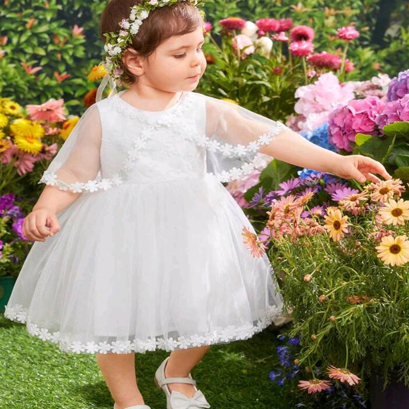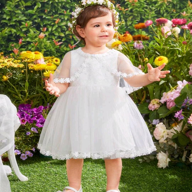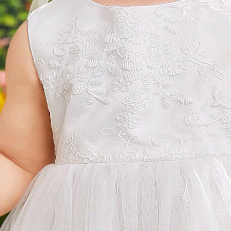 Conjunto de vestido blanco sin mangas de niña bebé con espalda de satén y malla bordada